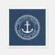 Napkins featuring a white, elegant anchor and rope emblem with customizable text "welcome aboard" and your boat name on a dark blue background.