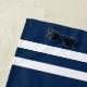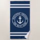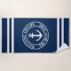 Welcome aboard custom boat name nautical anchor Beach Towel. Cool personalized beach towel for him or her. Make your own beach towel for sailing, boating, yachting, pontoon, summer, swimming pool, fishing and more. Maritime present for sailor, skipper, best friends, retiree, pensioner, family, retired husband, wife, boss, colleague, yacht owner, pontoon owner, cruise travel, swim instructor, retired co worker, retiring sailor, boat captain, coach, grandpa, grandma, kids etc. Customizable in different colours. Navy blue and white colour combination with red lifesaver logo. Bold vintage typography template. Large size beach towel. Round lifebuoy design and nautical stripes. Also fun for the beach or pool.