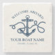 Add a cool personalized touch to your sailboat or yacht with these classic nautical Welcome Aboard stone coasters, featuring a navy blue anchor entwined with rope and easy to customize navy blue text templates for your boat name and registry.