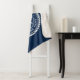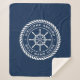 Sherpa blanket featuring a white, elegant ship's wheel and rope emblem with custom text "welcome aboard" and boat name on a dark blue background.