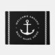 Door mat featuring a white nautical anchor and customizable text "welcome aboard" and your boat name flanked by rope borders. White design on black or custom colour background.