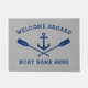 A beautifully inviting nautical theme doormat with welcome aboard and your personalized boat name, family name or other desired text. Features a custom designed boat anchor and crossed oars in navy blue on sea grey or easily customize the base colour to match your current decor. Makes a great gift.