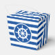 Welcome aboard nautical party favour boxes for boat trips, sailing excursions, on the water wedding parties, harbour club event and more. Personalized box for thanking guests. Custom message on the side. Modern blue and white stripe print with boat steer silhouette. Customizable background colour. Nautical maritime theme design. Bucket shape with handle.