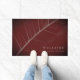 Modern decorative doormat features "Welcome" and address with simple a minimalist abstract macro leaf design in a burgundy and grey colour palette