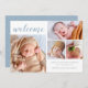 Announce the arrival of your baby boy with this modern double sided birth announcement. Front features welcome in a dusty blue calligraphy and a four photo collage of your favourite baby photos. Personalize with your baby's name, birth date, birth stats and parents names.