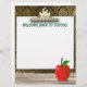 Cute custom letterhead stationery on a gold clip hanging from gold damask wallpaper that says "Welcome Back To School!" in green text. Or, just leave out the text entirely by deleting it. One red apple with green leaf illustration on a wooden desk is on the bottom corner. Lots of copy space to write on later. Great personal gift idea for teachers, doctors, nurses, health professionals, etc. Remember, "An apple a day, keeps the doctor away!"