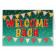 This is a welcome back card featuring the text WELCOME BACK in a large, bold font in red and orange. There is bunting in the upper and lower sections of the card plus a liberal sprinkling of gold glitter effect confetti. The design is set against a green gradient background going from dark to light from the top to the bottom.