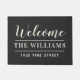 Elegant and timeless custom doormat features "Welcome" in calligraphy script writing with your family's last name and your home's street address personalized in white with simple stripe accents. Note, the black background and white text colours can be modified to coordinate with your porch or entry decor.