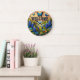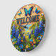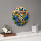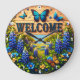 This circular wall clock features a beautiful, vibrant scene with "WELCOME" in bold, blue lettering at the top. The main design showcases a field of blue and purple lupin flowers, surrounded by other colourful wildflowers and green foliage. Several blue and orange butterflies flutter around the blossoms. The top section of the clock face has a light wood grain texture, adding a rustic touch.