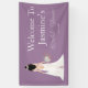 This boho-themed Welcome banner features a stunning boho bride with black hair in a delicate lace wedding dress. Adorned with a lush bouquet of roses, pampas grass, eucalyptus, and ranunculus, it’s the perfect way to set the tone for a joyful gathering. Celebrate love, laughter, and unforgettable memories with this charming design.