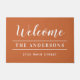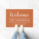 Elegant and timeless custom doormat features "Welcome" in calligraphy script writing with your family's last name and your home's street address personalized in white with simple stripe accents. Note, the burnt orange / terracotta background and white text colours can be modified to coordinate with your porch or entry decor.