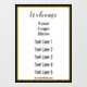 At the top, black script forms display text for you can edit to create a custom message. (Shown: Welcome) Next, there's a display image you can replace with a photo or company logo if desired (Image Shown: Your Logo Here). Additional lines of display text are under the image. You can edit the display text to create custom text. All text is black. The window cling has a black and faux (not foil) gold border.