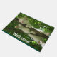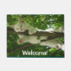 A white kitten lying on a tree branch amidst lush green foliage. The kitten's fur is pure white, contrasting with its pink nose and paw pads. Its eyes are a striking yellow. The kitten is positioned on a sturdy, brown tree branch, with leaves surrounding it, creating a natural frame. The word "Welcome" is written in bold, white letters at the bottom of the image. The lighting is soft and natural, highlighting the kitten's features and the vibrant green of the leaves. The composition is balanced, with the kitten as the central focus, surrounded by the natural elements of the tree.