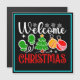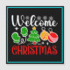 Cheerful Welcome Christmas design featuring a festive tree, ornaments, mittens, and snowflakes—perfect for holiday gifts, decor, and seasonal apparel. (Designcode-23758).