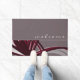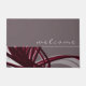 Welcome doormat features a modern artistic abstract ribbon design with shades of burgundy wine and grey with white accents and a custom welcome message. The top portion features a simple plain grey background with "welcome" presented in a modern lower case script. The bottom portion features grey, burgundy, white and wine coloured ribbons that are layered and interspersed to give perspective and depth against the grey background.