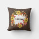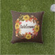 This collage-designed throw pillow features a fall season design on a dark brown background. The wreath was created by hand layering a variety of fall season flowers and leaves. The centre of the pillow is where you will personalize with your own text or buy as shown "Welcome". Use this pillow on your front porch to welcome guests to your home or on your patio. If you prefer to use indoors then choose another fabric.