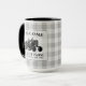 A beautiful, rustic themed large, 2 tone coffee mug, featuring artwork of a vintage farm tractor silhouette with text reading "Welcome to our farm" and your family name, established date or other desired text. This unique design rests on top of a grey and white country plaid print. To see more designs like this, feel free to visit my store here at "Zazzle.com/Rustic_Charm". Thanks.