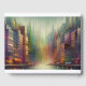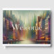 A peaceful suburban scene with waterways and the colorful skyline of the city beyond