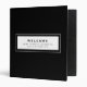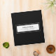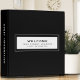 Modern guest information binder features a minimal design in a classic black and white colour palette. "Welcome" and custom address and guest information subject presented in simple font in a white window with a coordinating frame.