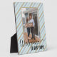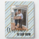 Blue striped "Welcome Home" photo plaque with easel. Add an image to personalize this photo frame. Ideal photo frame for new home owners or renters. Makes a nice photo gift from family, neighbour, realtor, lender, builder, and nicely complements most home decor.