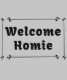 Lettering ‘Welcome Homie’ framed by four lines. Black and white, minimalist, yet elegant, monochrome style.