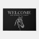Welcome horse door mat for home, stable or barn. Black and white entry rug with custom family name. Elegant typography with modern line art drawing of stallion. Available in small and large size. Customizable colours.