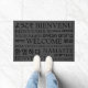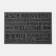 Welcome in many different languages black and charcoal grey elegant serif typography modern fun pattern Doormat.