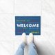 A fun design done in white, red, blue, green and purple of the word language in many foreign languages against a blue background on a door mat. English, Spanish and Italian are just some of the examples!