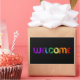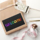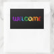 Welcome: a welcoming inclusive message written in rainbow colours. An original take on the rainbow flag!