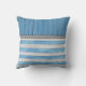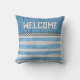 Welcome your guests with this blue and white throw pillow. Rustic design with simulated wood and stripes.