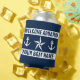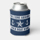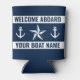 Welcome on board custom boat name nautical star Can Cooler. Custom beverage holder with maritime theme template design. Elegant accessories for beach home, yacht, lake house, cruise cabin, bedroom, sailing boat, beach party etc. Personalized Birthday gift ideas for friends, family, sailor, skipper, fisher, boat captain, dad, husband, grandpa, father, mom and others. Customizable colours. Also great for wedding party. Navy blue and white stripes with anchor symbols and star icons. Double sided print.