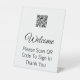 A display image is at the top. You can replace it with your qr code or another image. The display text can be edited to show your desired text. The sign is white. The text is black. Display text reads: Welcome Please Scan QR Code To Sign In Thank You