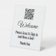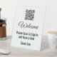 Welcome your visitors with this black and white sign. A QR Code is at the top. (Remember to enter your website for the QR code to work correctly.) The display text can be edited to show your desired text. Display text reads: Welcome Please Scan to Sign In and Have a Seat Thank You