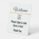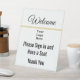 Welcome your visitors with this branded welcome sign. The template includes a display image you can replace with your logo. This white sign has black display text. Also, the display text can be edited to show your desired text. Display text reads: Welcome Please sign in and have a seat Thank You