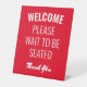 Welcome Please wait to be seated thank you stylish Pedestal Sign. Elegant desk counter sign for welcoming guests in your restaurant, cafe, bar, club, cafeteria, shop, store, event, diner, wedding, party, company, business, hotel, room etc. Red and white or custom colours. Classy font can be changed too.