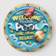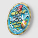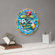 This circular wall clock depicts a vibrant 3D-style pool scene with a red beach chair and a colourful beach ball. The words "WELCOME TO OUR POOL" are prominently displayed, along with "COME, SWIM, RELAX!" in bold yellow letters. The background features undulating blue water and subtle white wave patterns, all encased in a shiny golden, ribbed frame.