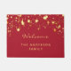 A chic red background colour with dripping faux gold stars. With the text: Welcome. Personalize and add your family name. Golden coloured letters. Glamourous and modern for your home.