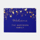 A chic classic navy blue background colour with dripping faux gold stars. With the text: Welcome. Personalize and add your family name. Golden coloured letters. Glamourous and modern for your home.