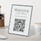 Welcome your visitors with this black and white tabletop sign. There's a display image at the bottom. You can replace the image with your own QR code to send your customers to today's menu or a price list. The display text can be edited to show your desired text. Display text reads: Welcome Elizabeth's Coffee Bar Scan for Today's Menu.