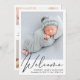 A simple elegant birth announcement featuring your newborn's photo overlayed with "Welcome" in a stylish script. Add your baby's name, birth date and birth stats. On the back, add another 3 photos and a personalized message.