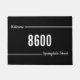 Large white house numbers can be personalized to make a unique housewarming gift. The house numbers are in the centre of a black doormat. Above the numbers, you can write your custom message (shown: Welcome). Make it a street address sign by changing the display text under the house number to the recipient's street. All text is white and can be edited or deleted.