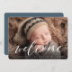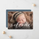 A sweet and elegant birth announcement design featuring a full bleed horizontal or landscape oriented photo with "welcome" overlaid in chic white calligraphy script lettering. Your baby's name and birth stats appear beneath. Add three additional square photos to the back, along with a personal message.