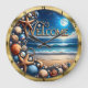 This circular wall clock presents a captivating moonlit beach scene. The foreground is adorned with a rich assortment of iridescent seashells, pearls, and starfish. The word "WELCOME" is intricately crafted from golden, pearl-studded script. Behind it, moonlit waves gently lap the shore under a starry sky, all encased in a golden, ribbed frame.