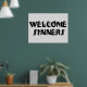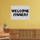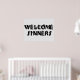 Spider web decorated words say "Welcome Sinners!" so you'll make sure to attract the right kind of crowd whenever you go out to bars, taverns, parties, and other gathering spots for fun and good times.