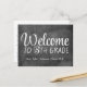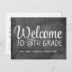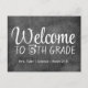 Chalkboard design personalized postcard to welcome new students on the first day of school. Text reads "Welcome to the Xth Grade." The text underneath describes the teacher's name, subject and room number. Cursive message to the student on the back can be customized as well. Bulk discounts available.