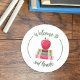 Un autocollant rond blanc avec une pile de livres et une pomme rouge sur le dessus pour accueillir vos jeunes élèves le premier jour de l'école. Personnalisez le texte avec votre niveau de note en utilisant le modèle fourni. Ce design est également disponible en noir. © ArianeC Illustrations-Tous droits réservés