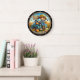 This charming autumn-themed clock features a friendly scarecrow wearing a sunflower hat, sitting on the back of a blue pickup truck filled with pumpkins in a sunflower field. A wooden sign reads "WELCOME TO MY PATCH". The clock has a black border with white numbers 1-12.
