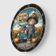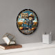 This charming autumn-themed clock features a friendly scarecrow wearing a sunflower hat, sitting on the back of a blue pickup truck filled with pumpkins in a sunflower field. A wooden sign reads "WELCOME TO MY PATCH". The clock has a black border with white numbers 1-12.