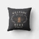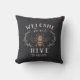 Welcome guests with this cute bee themed throw pillow featuring a vintage style honeybee illustration adorned with botanical leaf detailing. "Welcome to our hive" appears in ivory lettering. Personalize with your family name along the bottom.
