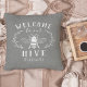 Welcome guests with this cute bee themed throw pillow featuring a vintage style honeybee illustration adorned with botanical leaf detailing on a soft grey background. "Welcome to our hive" appears in white lettering. Personalize with your family name along the bottom.